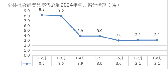 (三)社会消费品零售1-8月份,全县社会消费品零售总额完成198835.6万元,去年同期完成192950.6万元,同比增长3.1于全市增速0.6个百分点(全市增速3.7),全市总量排名第7位,增速排名第9位,5个农业旗县总量排名第3位,增速排名第5位,两年平均增长4.7
