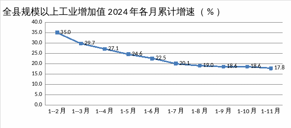 1-11月份完成工业产值88.95亿元,占全县规上工业总产值30.64%去年同期完成89.51亿元,同比下降0.63拉全县规上工业总产值0.2个百分点。10月当月完成工业产值7.37亿元,11月当月完成工业产值7.18亿元,环比下降2.58产值同比下降原因受新能源市场影响,托一电今年火力发电需求低,导致产值同比下降。