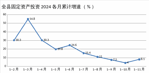 1-11月份,全县固定资产投资完成574659万元,去年同期完成531364万元,与去年同期相比增长8.1%于全市增速11.9个百分点(全市增速20),全市增速排名第7位(含开发区),5个农业旗县增速排名第3